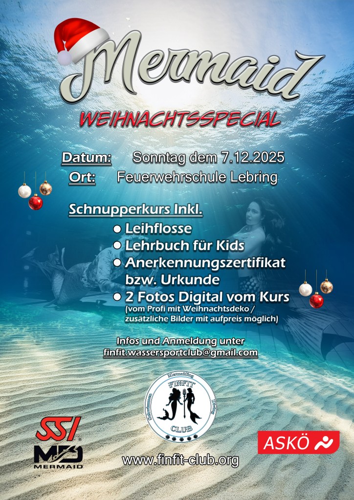 Schnupperkurs ist natürlich auch der Mermaid Pro Kurs möglich (auf Anfrage). Mit in diesem Weihnachtsspecial inkludiert sind zwei Fotos mit Weihnachtsdeko von einem Professionellem Unterwasserfotografen. Jetzt schnell einen Platz Sichern !!